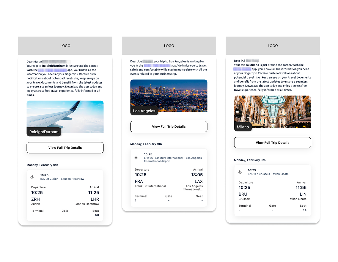 The first element of the recipient’s upcoming trip is displayed within the service email.